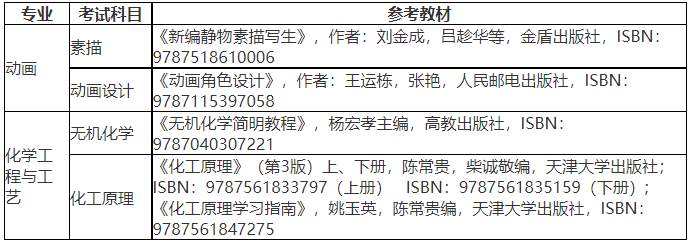 第七条 动画专业考试科目为《素描》、《动画设计》;化学工程与工艺专业考试科目为《无机化学》、《化工原理》。考试科目每科满分100分。参考教材如下: